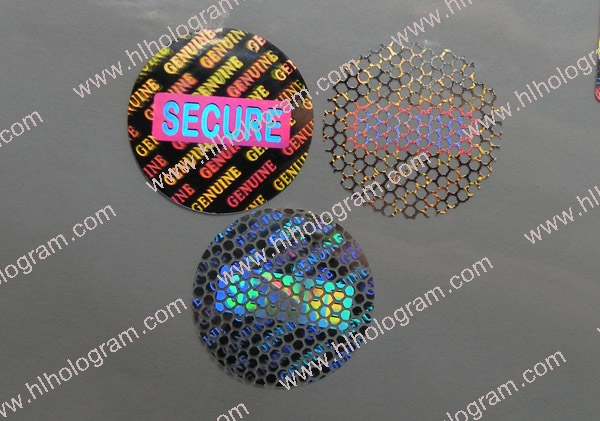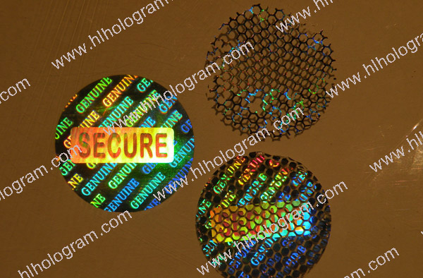 SECURE GENUINE, 2D/3D holographic sticker, two layers, two color in forground, two color in background with good depth and shiny foreground. Honey Comb Tamper Evident Pattern Released.